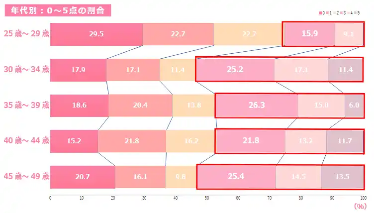 年代別では、25~29歳の不満3点以上は25.0%にとどまる一方、30~34歳で53.7%、45~49歳で53.4%と、30代以降で不満が一気に高まる傾向。 |