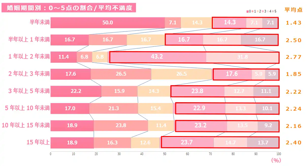 婚姻期間別では、「結婚1年以上2年未満」の不満度が最も高く、新婚期の「理想とのギャップ不満」が浮き彫りに。また、「15年以上」のベテラン夫婦でも不満3点以上が52.1%となり、「夫婦の総決算期」の課題が浮上。 |