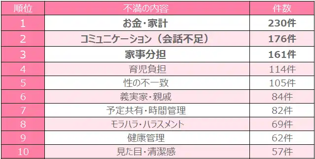 不満の内容トップ3は 1位:お金・家計(230件) 2位:コミュニケーション(176件) 3位:家事分担(161件) 以降、「育児負担(114件)」が続き、家計・会話・家事育児が三大不満に。 |