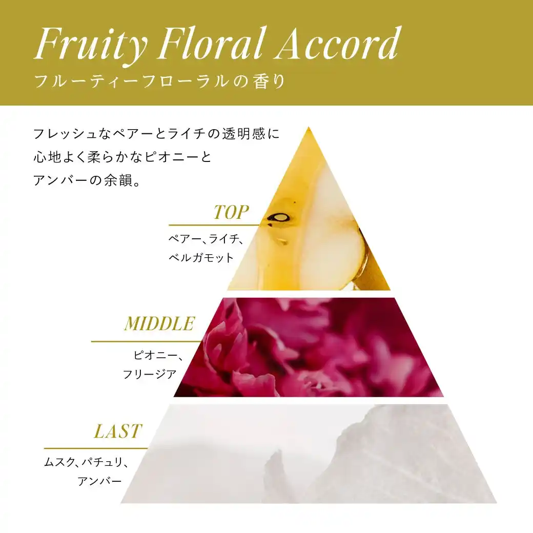 透明感のあるアプリコットの甘さに、咲きたてのローズとピオニーのピュアな華やぎが重なる、フローラルブーケ。ラストノートはアンバーとムスクがしっとりと調和し、髪にうるおいが満ちるような上質でやわらかな余韻を奏でます。 |