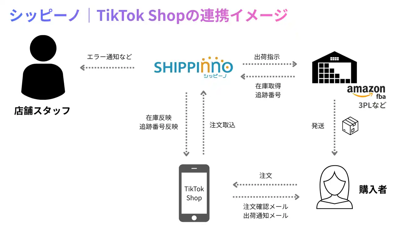 | セラーは、本API連携によりTikTok Shopの注文取得からFBAマルチチャネルサービス等の物流サービスへの出荷指示・実績管理、在庫更新までを完全自動化できます。 |