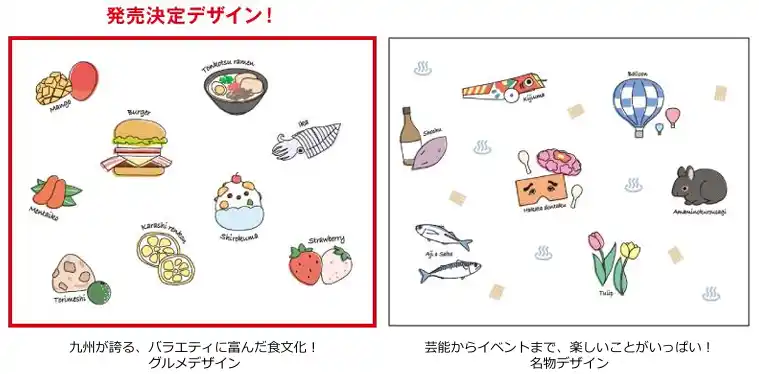 豚骨ラーメン、しろくま、呼子のイカなど、豊富な九州自慢の食べ物をイラスト化してデザイン。 |