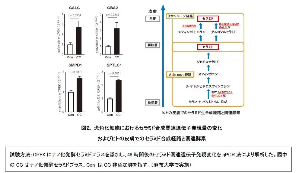本研究により、これまで人で確認できていた当社独自セラミドであるナノ化発酵セラミドプラスによるセラミド経路の遺伝子発現上昇および抗炎症作用が、犬の皮膚細胞においても確認されました。ナノ化発酵セラミドプラスは、犬においても、皮膚バリア機能の向上や炎症抑制において重要な役割を担うことが示唆されました。 |