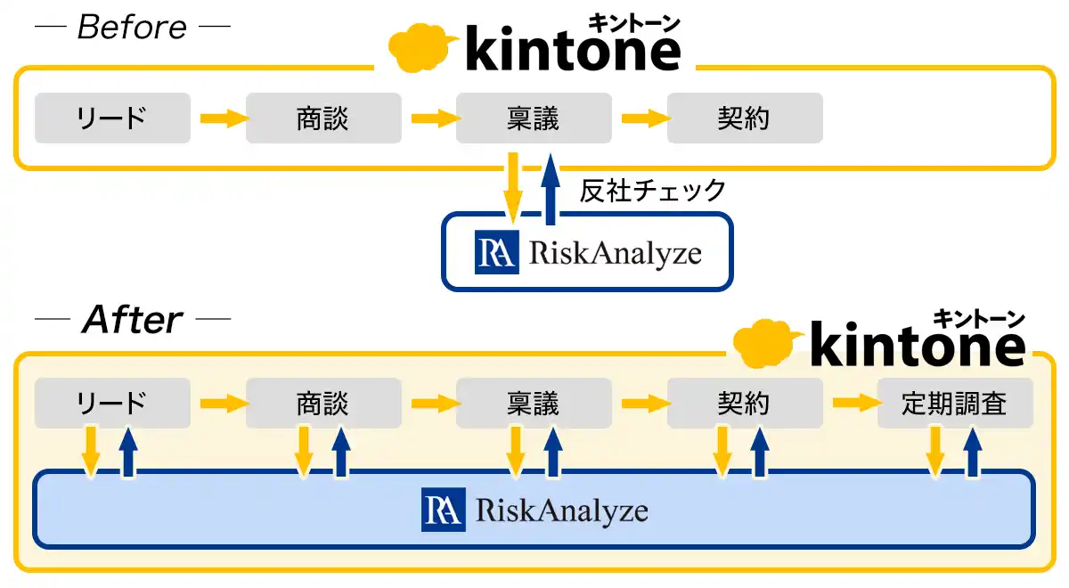 これにより、 ・kintoneとの技術連携の強化 ・共同での利用促進 ・企業のリスク管理DXを支援する機能開発 をさらに加速し、kintoneユーザーがより自然に「RiskAnalyze」を利用できる環境を整えてまいります。 |