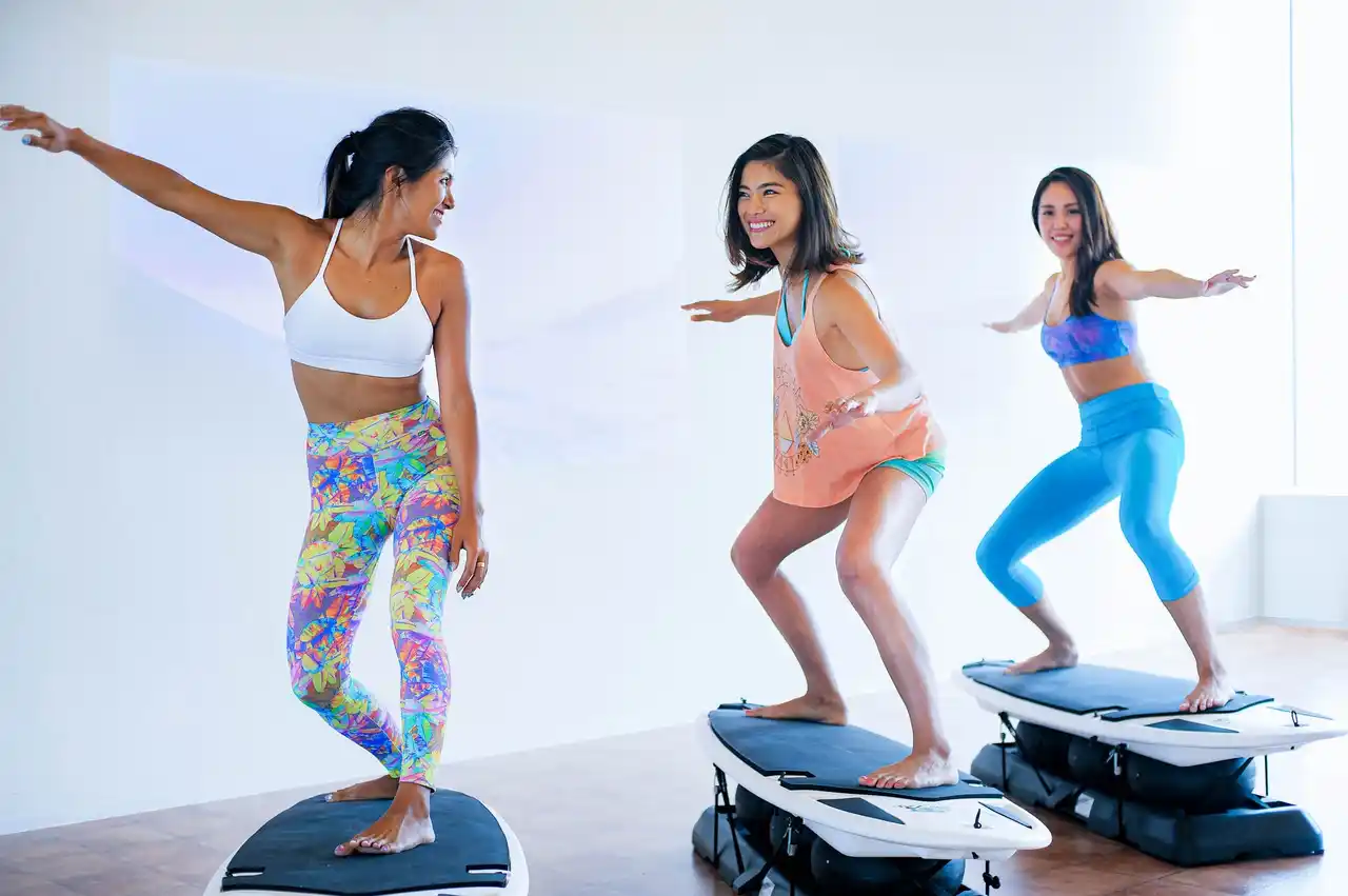 | 西海岸をイメージさせる店内と、夏のビーチの気温に合わせたスタジオは海に行けない多忙な女性たちを都会の真ん中でサーフトリップ。ゆらゆら揺れるボードの上で、アップチューンの音楽にあわせて体幹を鍛えるサーフエクササイズで、楽しくシェイプアップできます。 | |||||||||||||