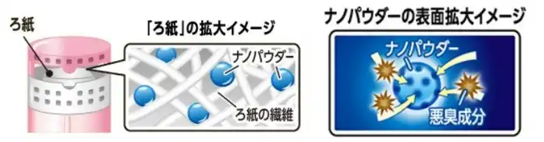 | この特許技術は消臭芳香剤「消臭力 玄関・リビング用」や「消臭力 トイレ用」に採用されています。ろ紙に配合されているナノパウダーは、ナノレベルの孔(あな)を持つ消臭剤で、この孔がさまざまな悪臭をすばやく強力に吸着することで、お部屋の複合臭やトイレ特有の尿のしみつき臭など、イヤなニオイを消臭しています。 | |||