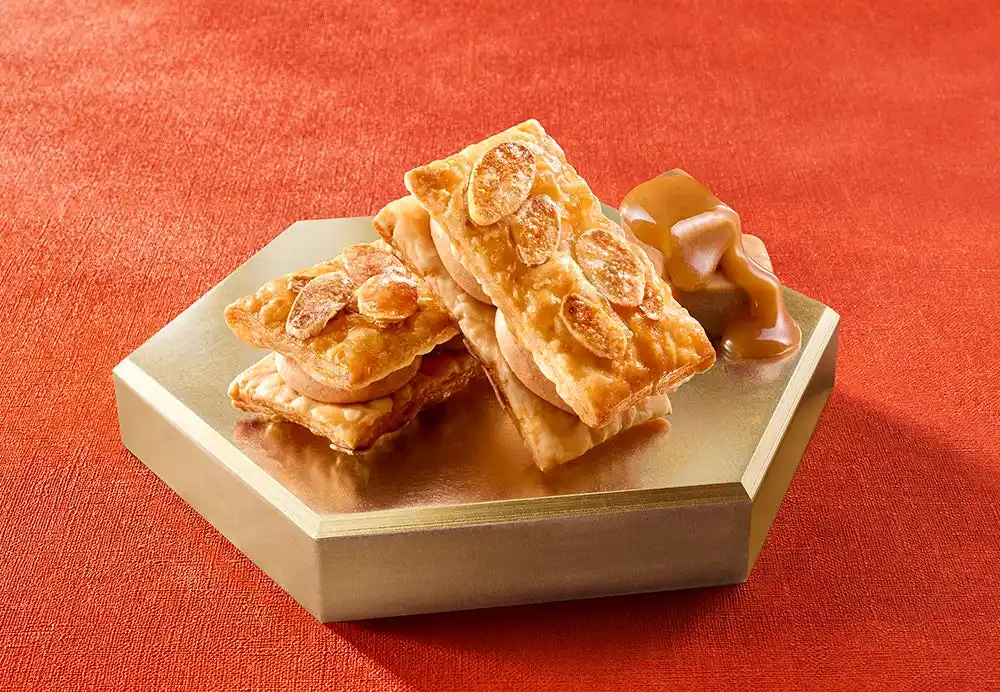 とろけるような柔らかさに仕立てた優しい甘さのバターキャラメルショコラクリーム。サクッと軽やかな108層のパイ生地にアーモンドスライスをまぶして、カリッと食感が楽しいフロランタン仕立てに焼き上げました。噛む度にほろ苦い香ばしさが口いっぱい広がります。 |
