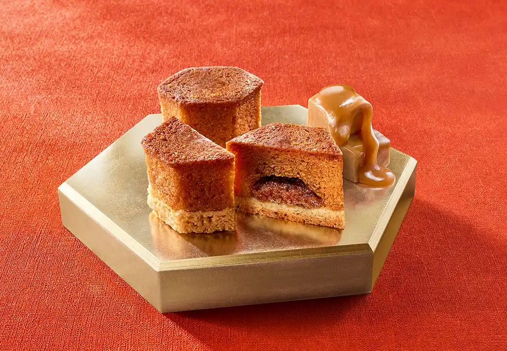 濃厚なコクのビターキャラメルペーストを、しっとりジューシーなバターキャラメルケーキに包んで王冠型に焼き上げました。ベースにしのばせたタルト生地が食感のアクセント。酪農王国ニュージーランド産バターの香りが、上品に響き合います。 |