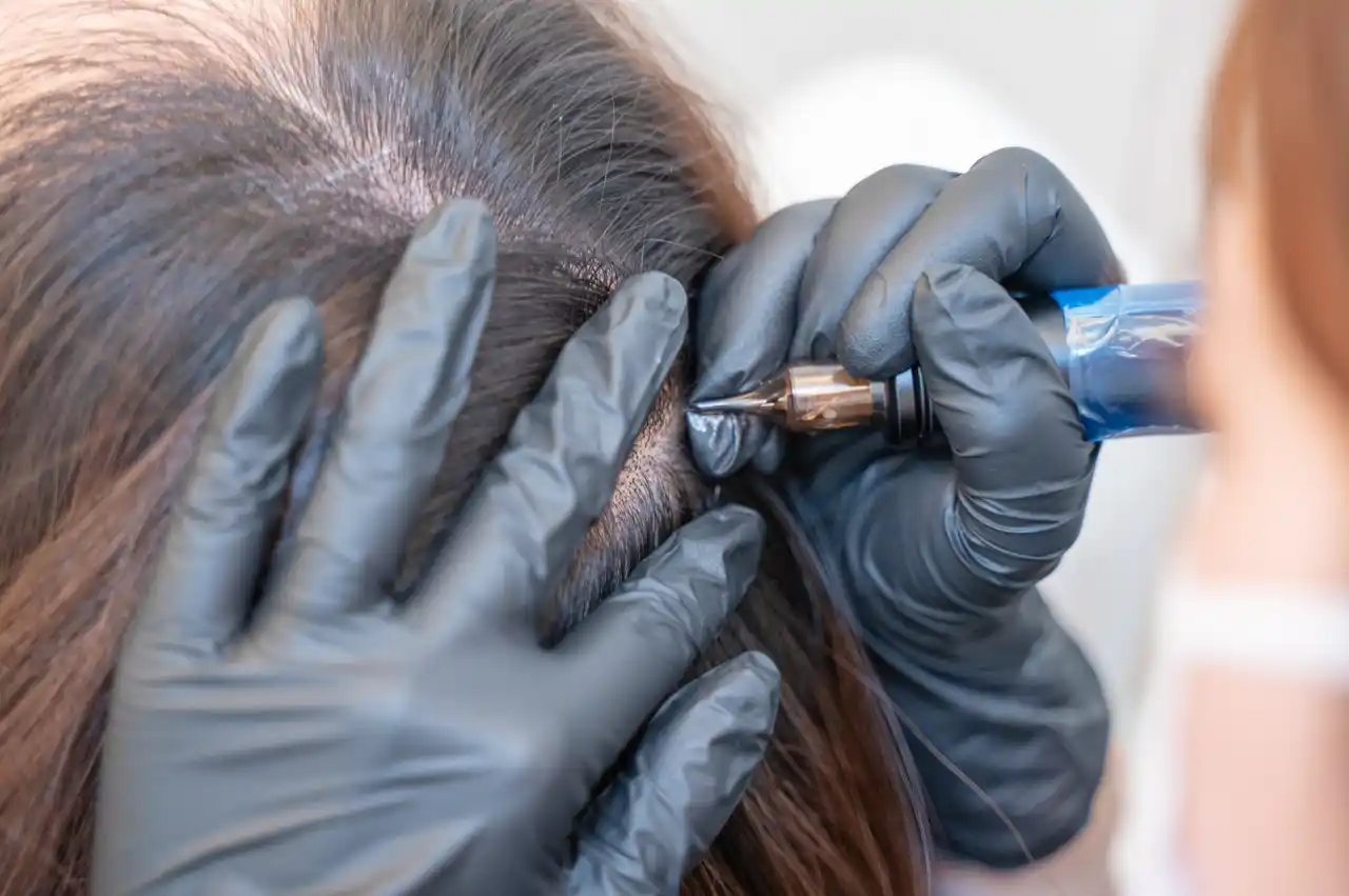 頭皮の真皮の上層部に微細な点を入れて、1点1点手動で頭皮に色素を注入します。施術時間は1~2時間半程度で行います。 |
