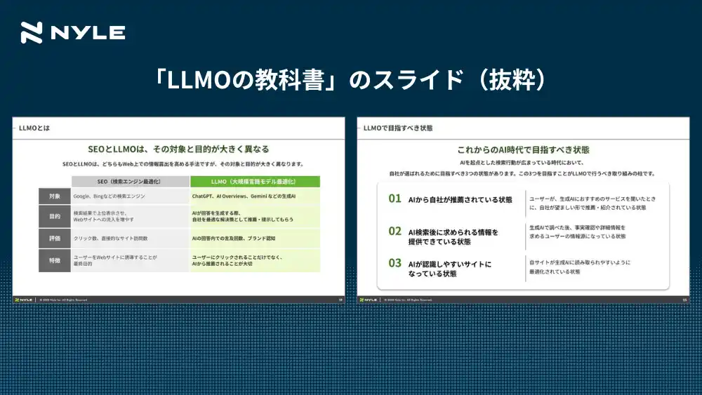 | そこで、ナイルが培ってきたLLMOのノウハウを「LLMOの教科書」として公開することで、企業がLLMOの第一歩を踏み出す後押しができればと考えています。 | ||||||||||||||||||