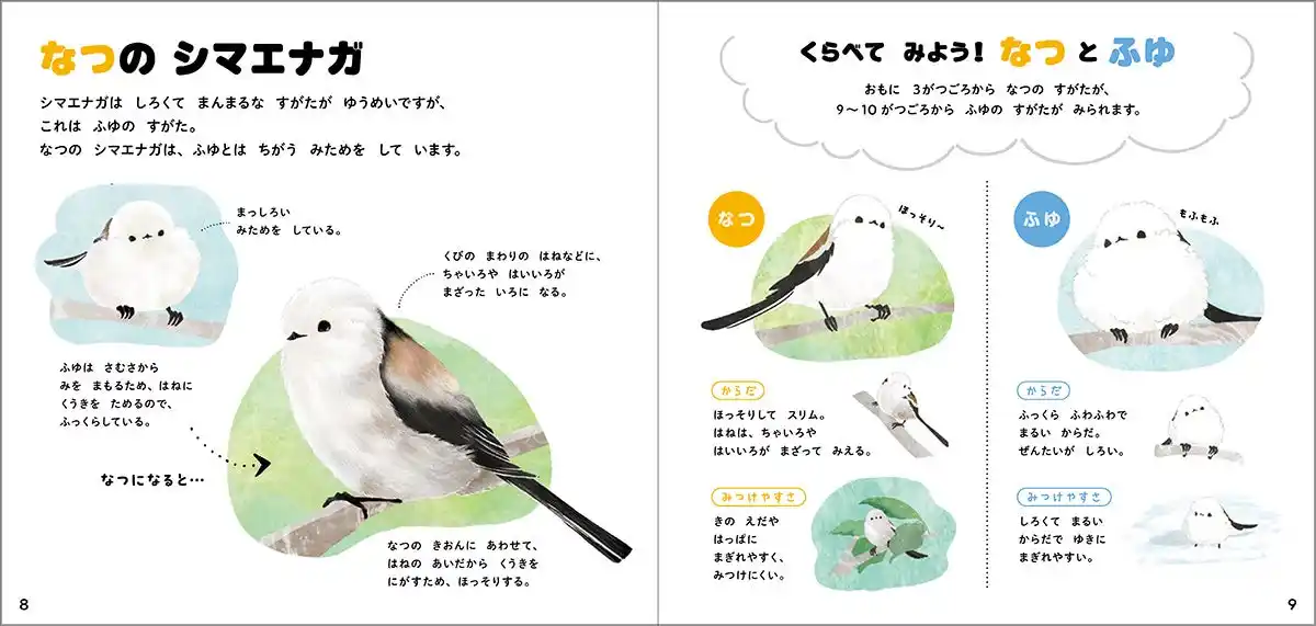 | 『学研のえほんずかん シマエナガのずかん』では、たくさんのイラストを通じて、シマエナガの生態について学べます。 | |||||||