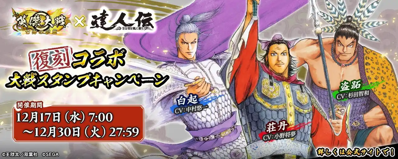株式会社セガ フェイブ(本社:東京都品川区、代表取締役社長執行役員:杉野行雄)は、本日2025年12月17日(水)より、現在稼働中のアミューズメント施設向け対戦型カードアクションゲーム『英傑大戦 七海の彩旗(以下、英傑大戦)』において、新バージョン「Ver.3.1.0」稼働と、漫画家 王欣太先生との復刻コラボイベントを開始したことをお知らせいたします。 |