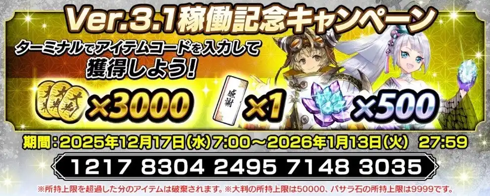 新バージョンの稼働を記念して、ターミナルにアイテムコードを入力いただいた方全員に大判×3000、バサラ石×500と感謝の手紙×1をプレゼントするキャンペーンも実施いたします。 |