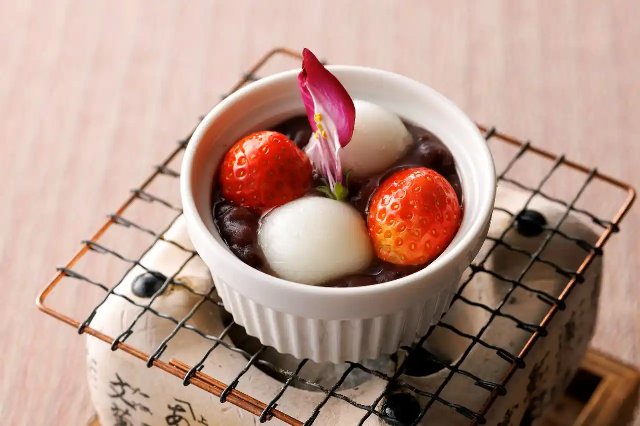 | テーブルに並ぶのは、どこを切り取っても苺尽くしの和の世界。看板のたい焼きはもちろん、スイーツからセイボリーまで、ひと皿ごとに「和×苺」の組み合わせを楽しめるよう丁寧に仕立てました。「苺の餡蜜」や「苺のせ北海道かぼちゃプリン」では、艶やかな苺の酸味と、北海道かぼちゃや餡のやさしい甘さが重なり合い、どこか懐かしくも新しい味わいに。一方、「苺と青菜のお浸し」や、鮪と本日の白身魚を苺塩でいただく「お造り」などのセイボリーでは、苺の香りとほのかな甘みが旬の素材の旨みをそっと押し上げます。 お食事メニューの「京ちらし鮨」にも苺の果実をしのばせ、見た目にも心躍る一品に仕上げました。また、フリードリンクに含まれる紅茶にも、ルピシアより苺香る5種のフレーバーをご用意いたしました。甘味と塩味、和の滋味と苺のフレッシュさが交差する、「和×苺」ならではのハーモニーを、どうぞじっくりとご体感ください。 | |||||||||||||||||||
