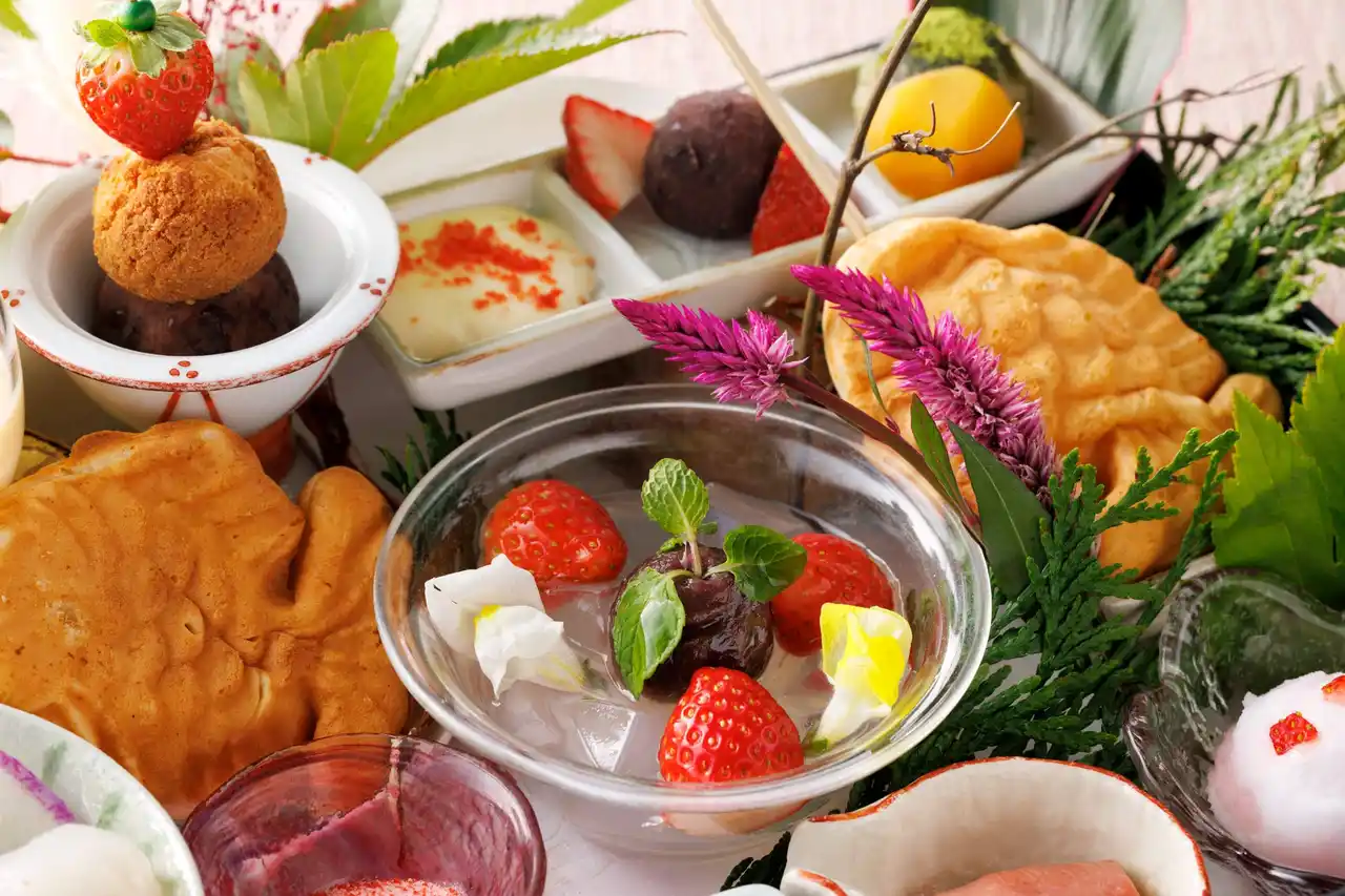 | 開催のたびにご好評をいただき、毎回楽しみにされるお客さまも多いからまつの人気企画「和のアフタヌーンティー」の第5弾。北海道の恵みと和の趣を織り交ぜた本プランが、この冬は旬の苺を主役に、まさに“苺一会(いちごいちえ)”の箱庭として装いも新たに登場します。すべてのメニューに苺をあしらった“苺づくし”に加え、地元で親しまれる「たい焼き一休北海道」とのコラボレーションも実現。和食文化と地域の魅力を五感で味わう特別なひとときをお届けします。 | |||||||||||||||||||