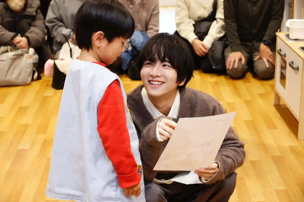 | 板垣李光人さんは「りひと先生」として園児たちの前に登場。大勢の子どもたちの前でのはじめての読み聞かせに、最初は緊張気味の板垣さんでしたが、園の先生たちと一緒に、手あそび歌を行って園児たちと打ち解けたあと、絵本『ボクのいろ』を朗読しました。 | |||||||