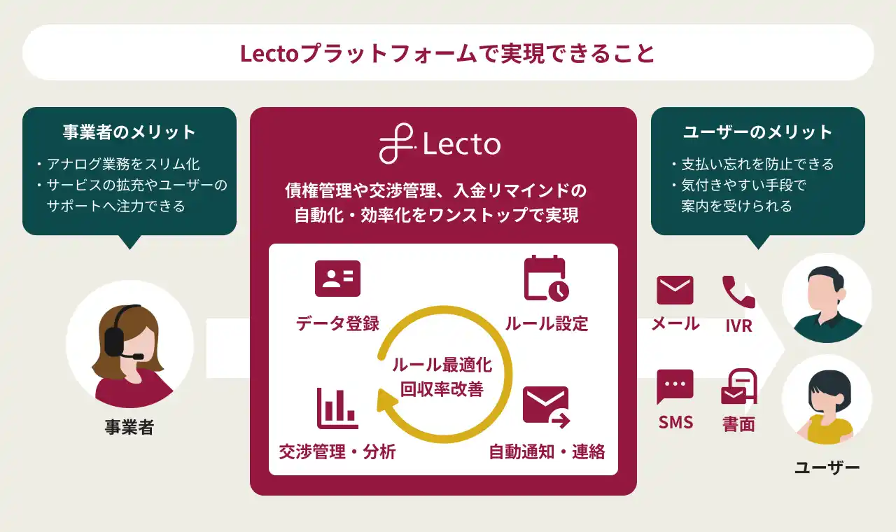 | ~ メールやSMSの自動化に加え、電話や書面対応といった人手のかかる業務まで自動化できる「Lectoプラットフォーム」で債権管理体制の構築を推進 ~ |