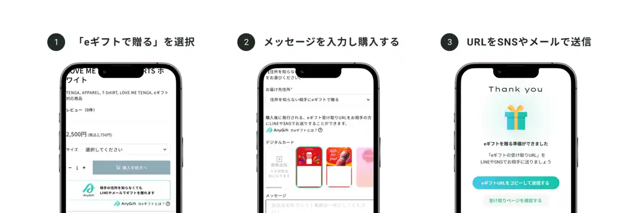 今回、AnyGiftの提供により、「TENGA公式オンラインストア」にて幅広い商品がeギフトとして贈れるようになりました。 |