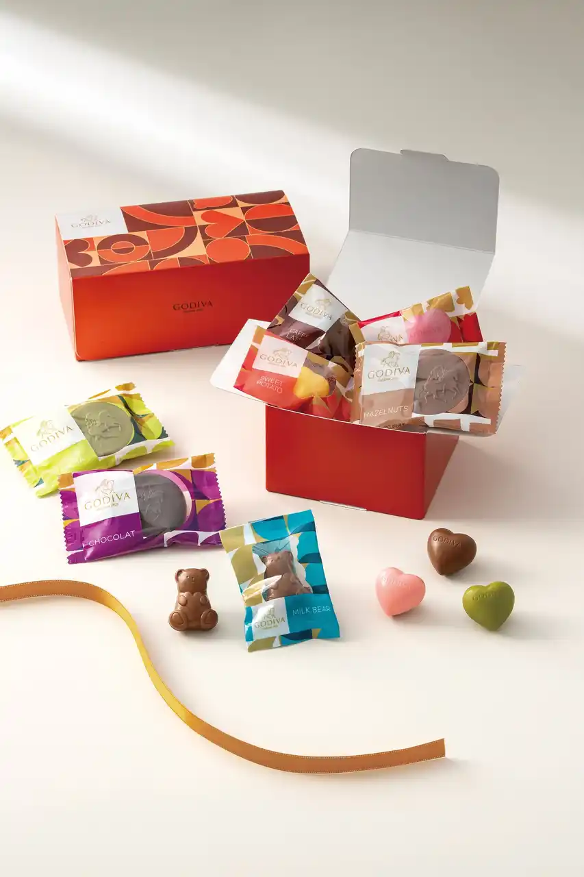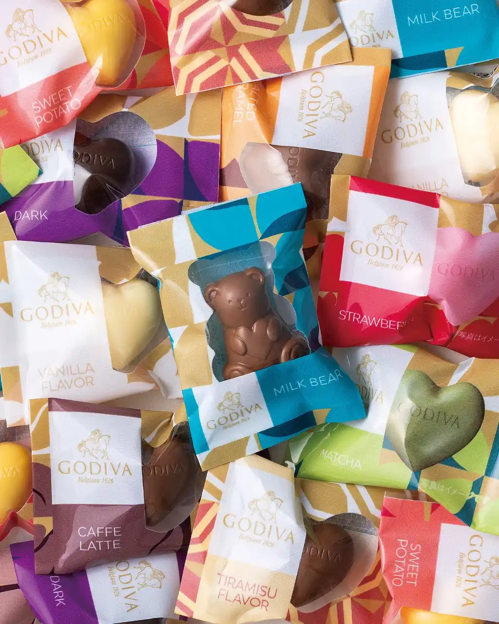| ハート形のチョコレートは、ゴディバのチョコレートをシンプルに味わえるミルクチョコレートや、期間限定の安納芋スイートポテト味などの全10種類。可愛らしいクマの形の「ジョイフルミックス ミルク ベア」は、メッセージやデザインが異なる4種類あり、レアなデザインのチョコレートを探す楽しみもあります。小さなフィンガーケーキ風焼菓子「プティガトー」は、こだわりのチョコレート、ビスキュイ、なめらかなソース、3層の異なる味わいと食感が織りなす贅沢な味わいです。自宅用の袋の他、カジュアルギフトに使える専用のギフトボックスもご用意しています。自由に選べる、自分だけの詰め合わせをお楽しみください。 | |||||||||||||||||||