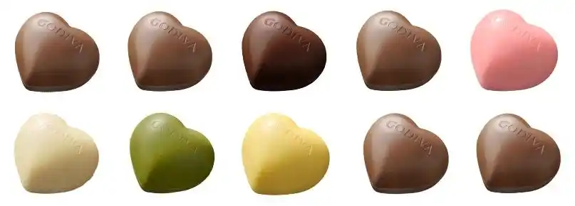 | 象徴的なハートの形のチョコレートの中には、さまざまな味わいのフィリングが入っています。なめらかな口どけのチョコレートのシェルと、フィリングの組み合わせをお楽しみください。 | |||||||||||||||||||