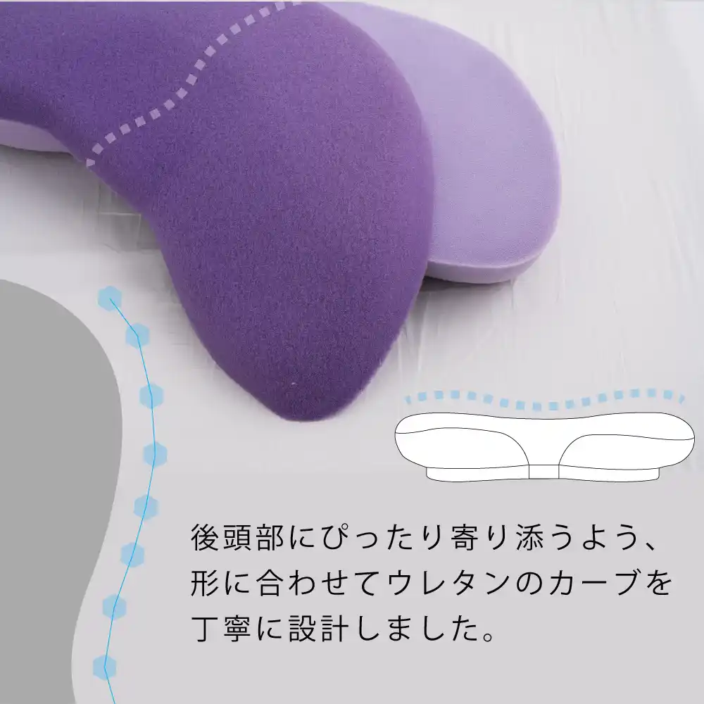 中材のウレタンフォームは頭部の形状に合わせた絶妙なカットで仕上げ、かたさの違う上下2層ウレタンフォームから成り立ちます。頭部の触れる上層はPCM配合のPCM Layer Formとなり、優しいタッチで支え、下層のウレタンフォームである程度しっかりと支える構造となっています。 |