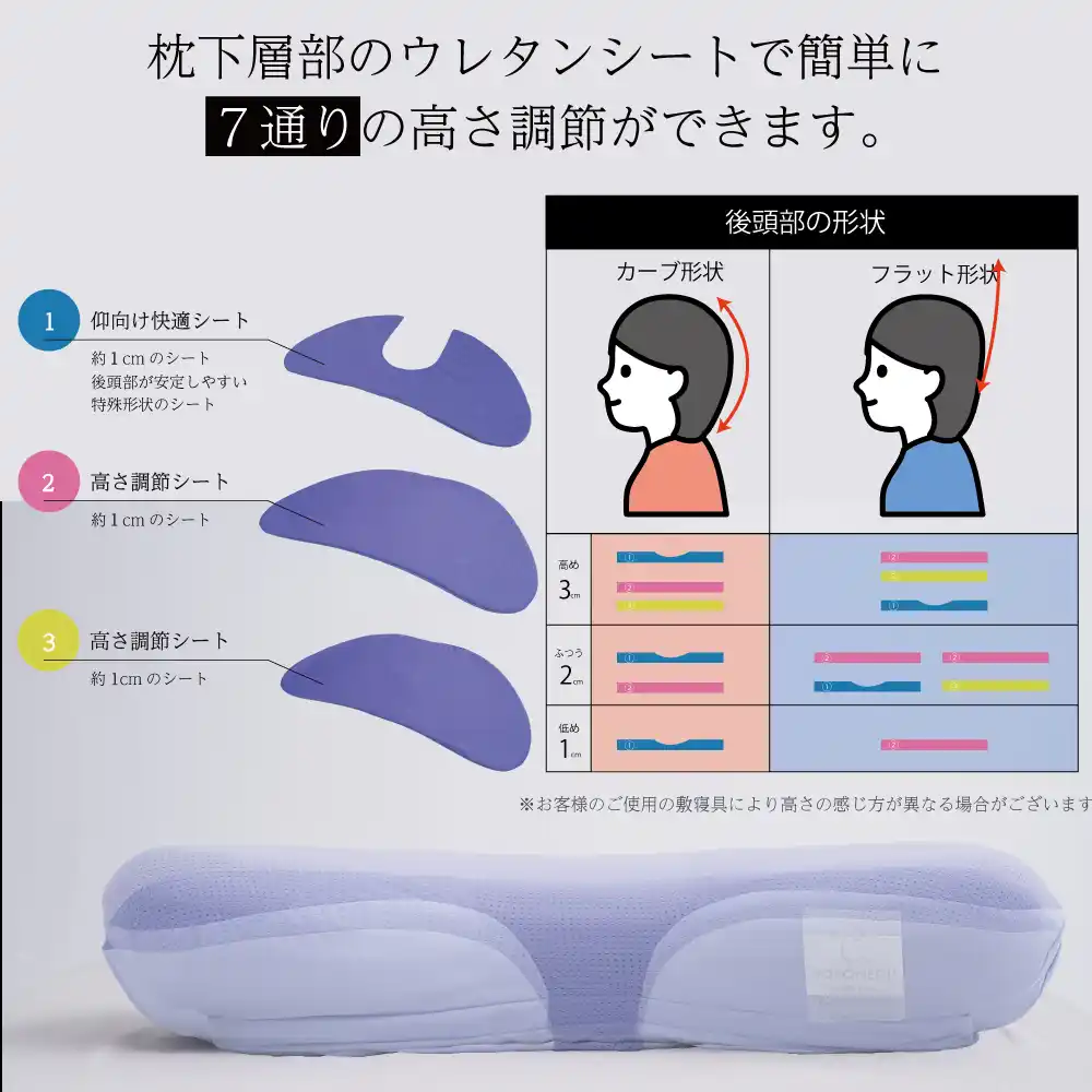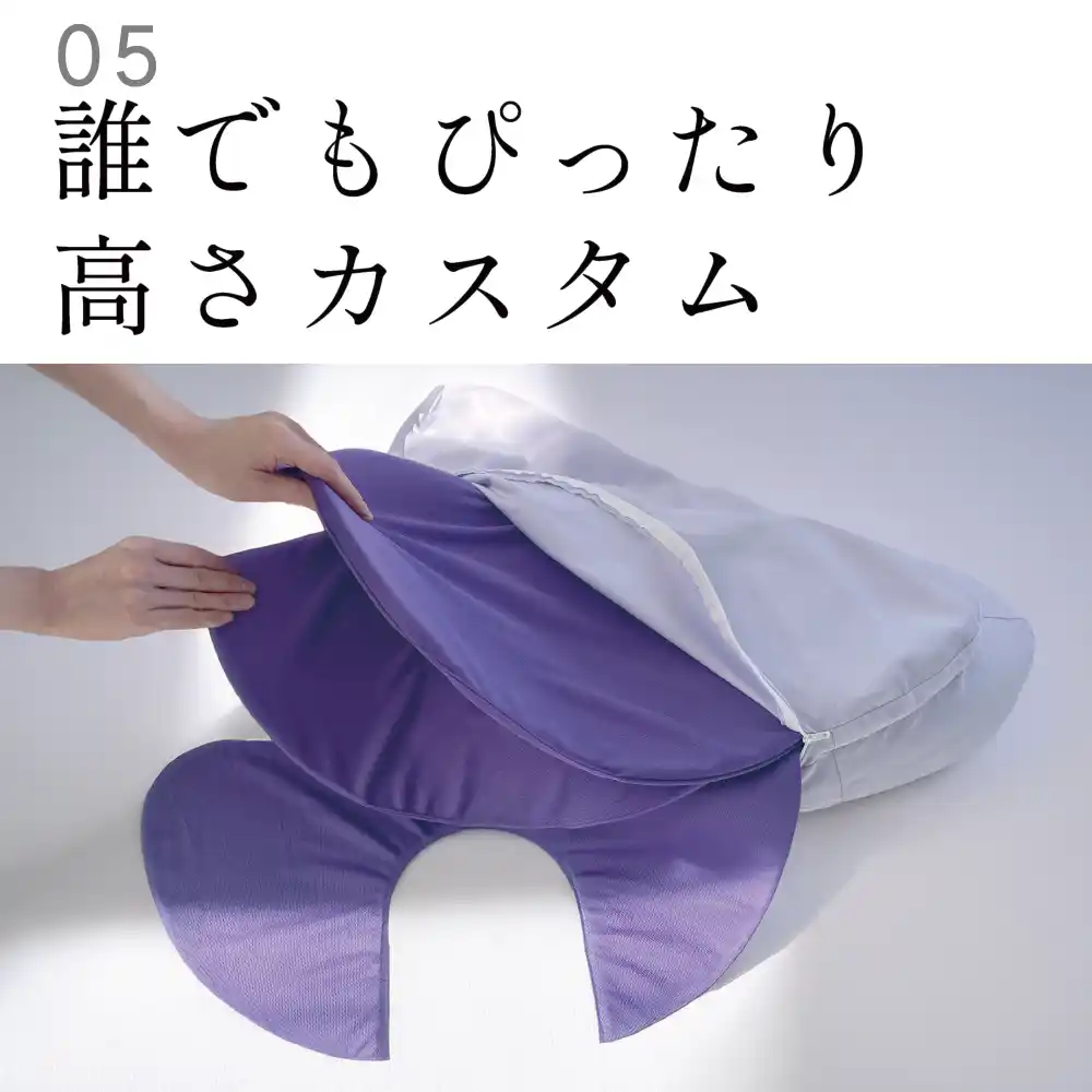 二階建て構造の下段部は3層のウレタンシートから成り立ち、抜いたり順番を入れ替える事で高さや後頭部の形状に合わせた自分だけのカスタマイズが可能となっています。 |
