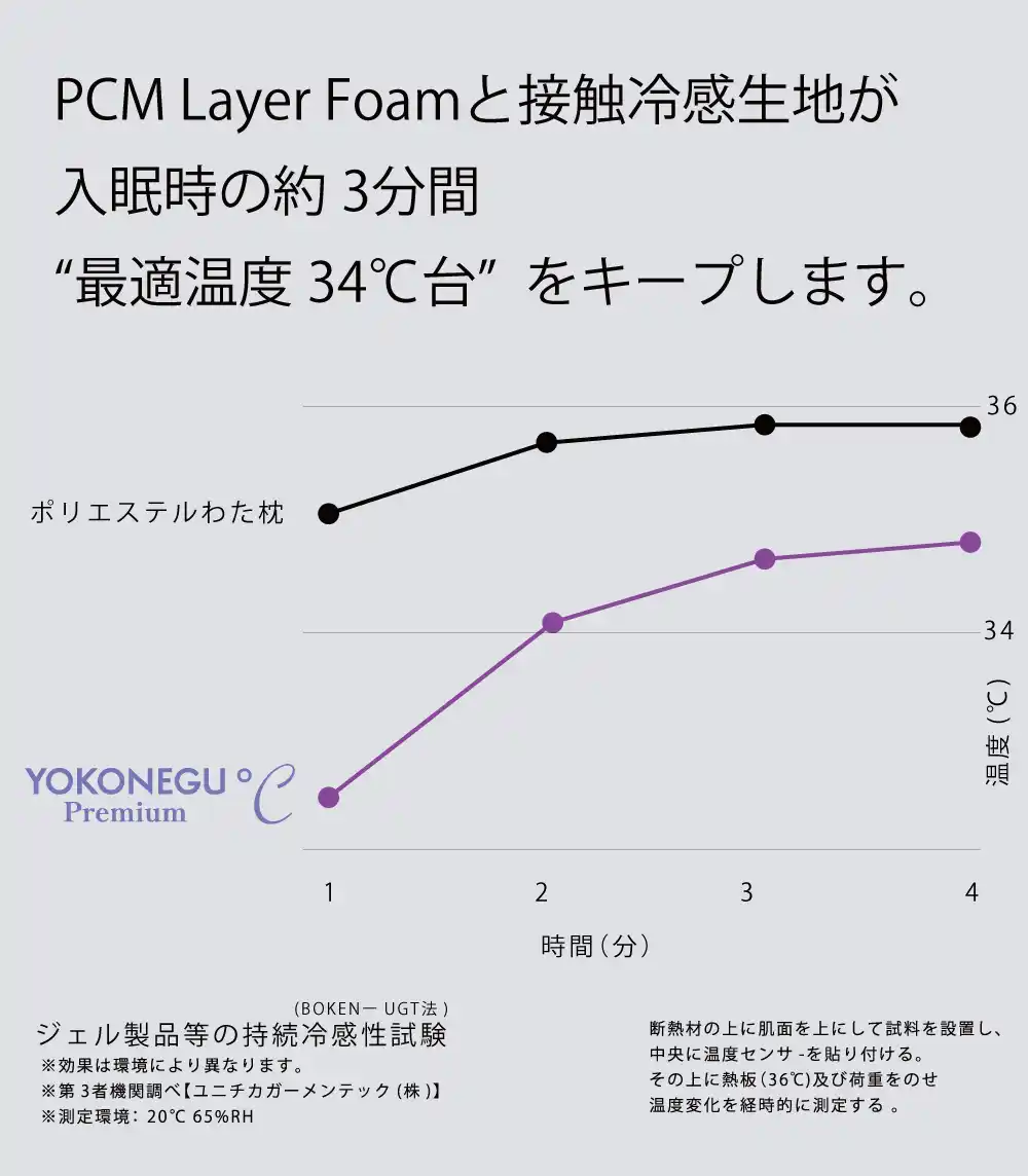 今回、そのPCMをYOKONEGU Premium ℃の上層部ウレタン(PCM Layer Form)に適量配合し、付属の接触冷感素材の専用カバーと組み合わせる事で、入眠時の最適温度と言われる34℃台を約3分間キープする事に成功致しました。 YOKONEGU Premium ℃は、従来の快適な寝姿勢にプラスして快適な入眠温度設定を備えたアイテム となっています。 |