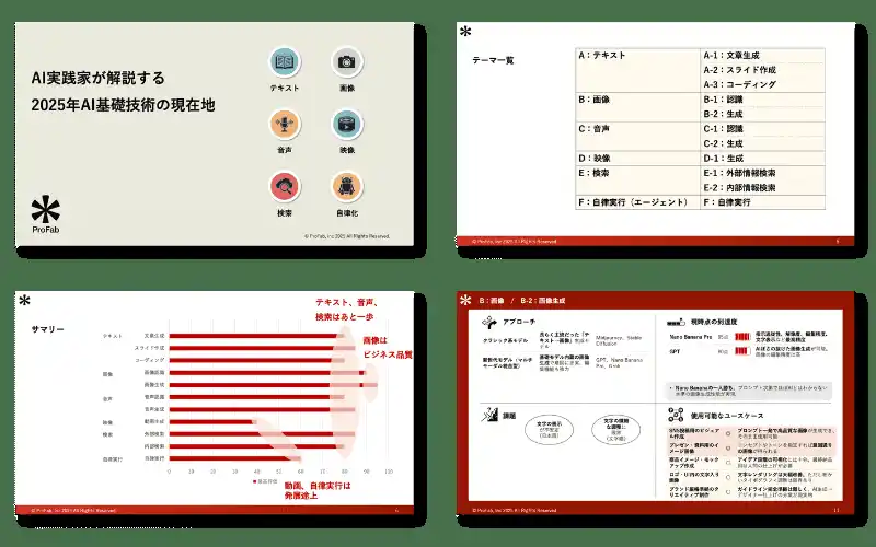 生成AI導入の顧問およびAIアプリ開発サービスを提供する株式会社ProFab(東京都中央区、代表取締役:川村浩太)は、AIの基礎技術を6つの領域に分類し、それぞれの到達度とビジネスユースケースをまとめたホワイトペーパー「AI実践家が解説する 2025年AI基礎技術の現在地」を公開しました。テキスト、画像、音声、映像、検索、自律実行(エージェント)の各分野について、現時点での実力値を点数化して解説しています。また、本資料の内容を基に、自社での活用方針を整理する「3社限定無料解説セミナー」の受付も開始いたします。 |