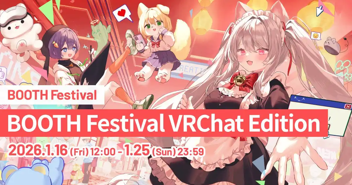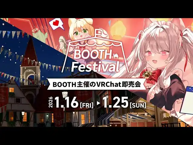 ピクシブ株式会社(本社:東京都渋谷区、代表取締役CEO:丹羽康弘、以下ピクシブ)が運営する創作でつながるクリエイターズマーケット「BOOTH」は、WebとVRChatが連動する即売会「BOOTH Festival VRChat Edition」を2026年1月16日(金)~1月25日(日)に開催します。 |