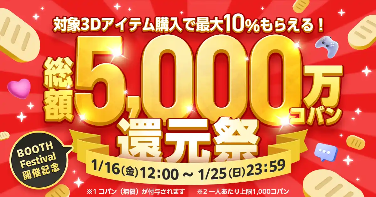 イベント開催中の2026年1月16日(金)~1月25日(日)に、「BOOTH Festival VRChat Edition」のイベントに設定されている商品を購入された方に、購入金額の最大10%分(お一人様あたり上限1,000円相当)のpixivcobanを付与するキャンペーンを開催します。 |