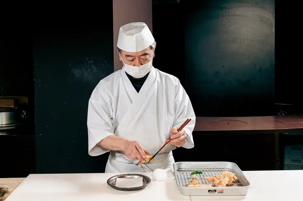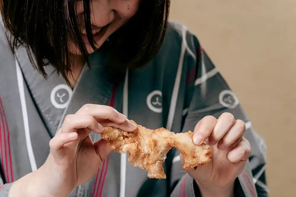 当館の調理長に代々受け継がれてきた秘伝の下地に漬込み、ふぐの旨味を楽しめるよう衣は軽めに。調理人が油の温度管理に細かく気を配りカラっと仕上げます。骨まわりのコラーゲンが溶けだし、まろやかで濃醇な味わい。女性でも手づかみで豪快に召し上がっていただきたい逸品。 |