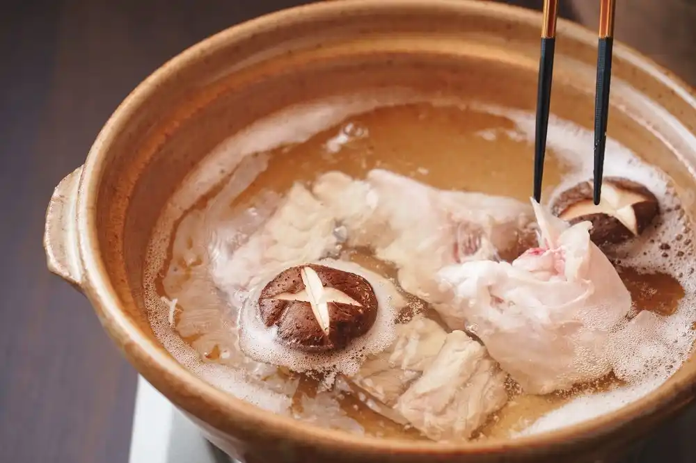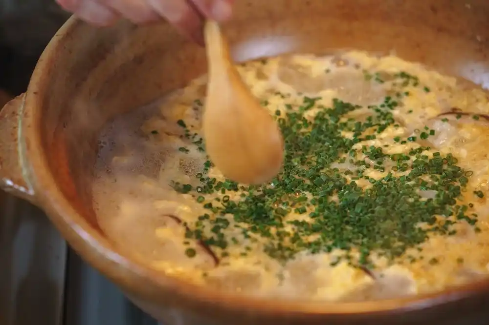 とらふぐのあらで仕立てる本場下関流のふくちり。川棚グランドホテルお多福ではおもてなし係がお客様の目の前でお作りし、一番美味しいタイミングでお取り分けいたします。とらふぐと地野菜の旨味がたっぷり溶け込んだお出汁で仕上げる雑炊は、とらふくフルコースを締めくくる至福の味。 |