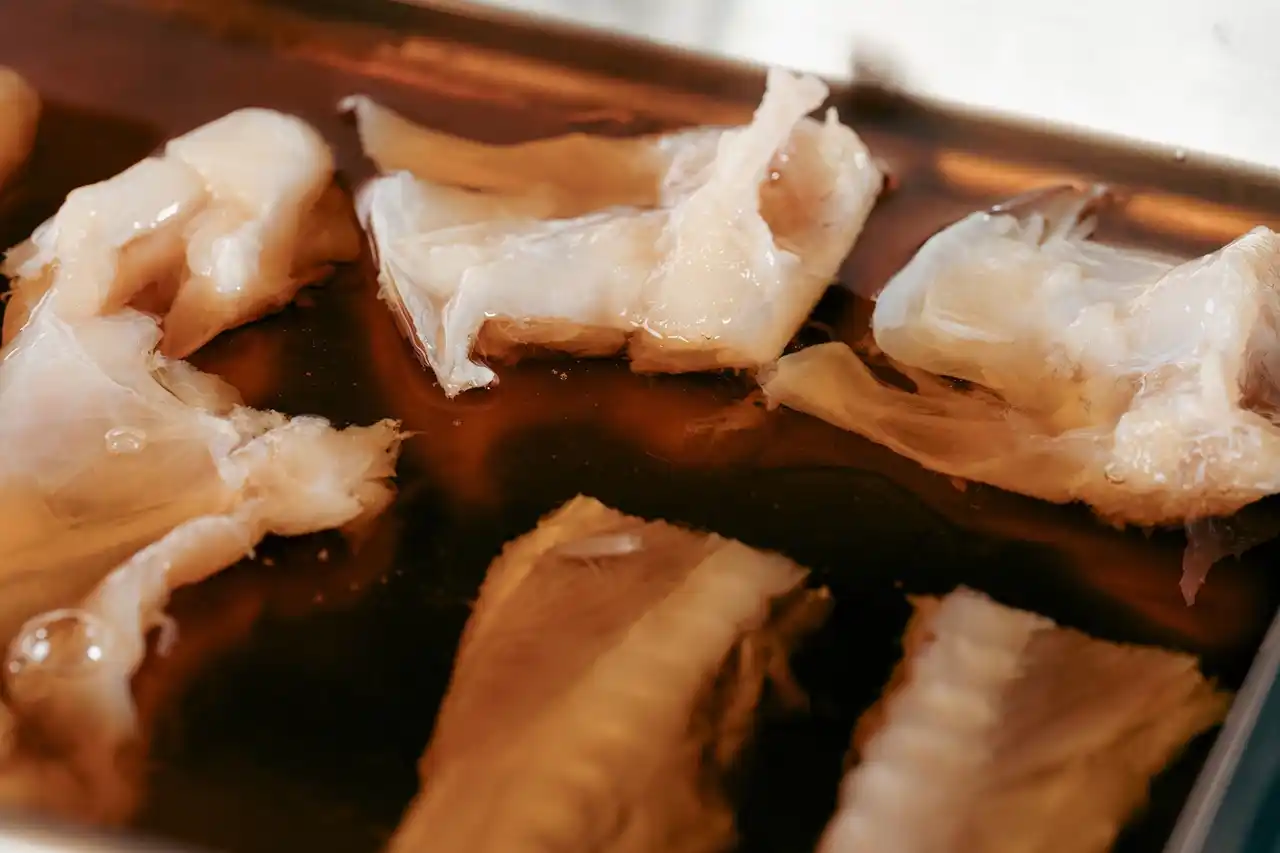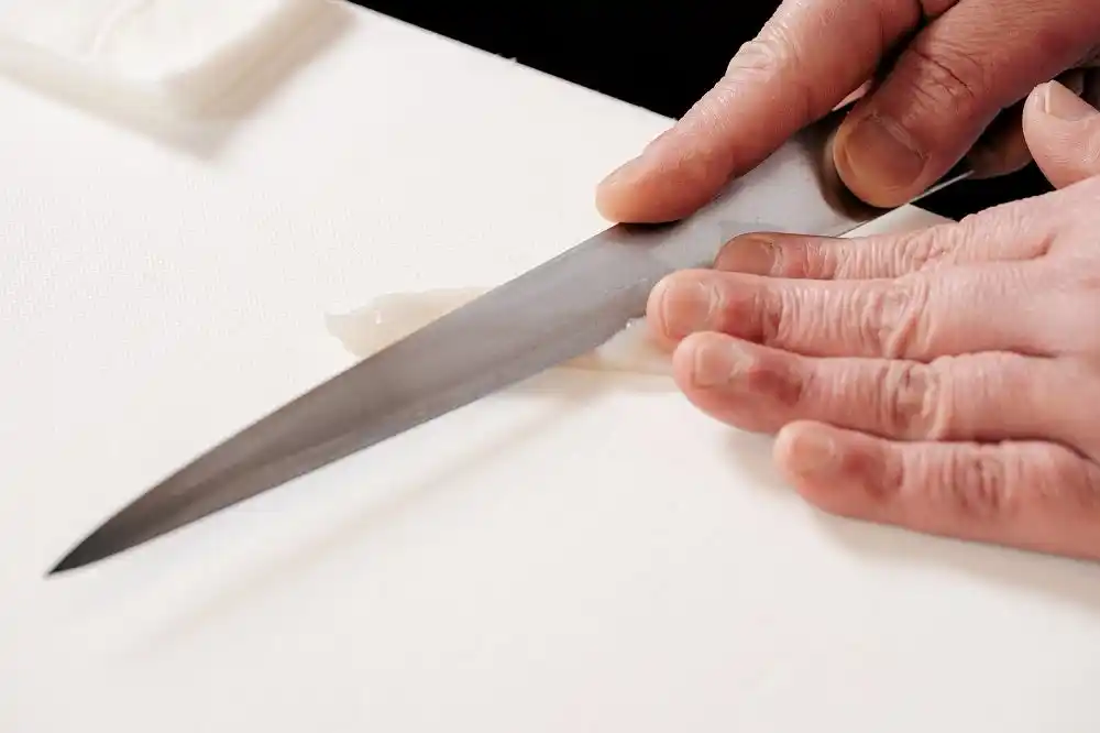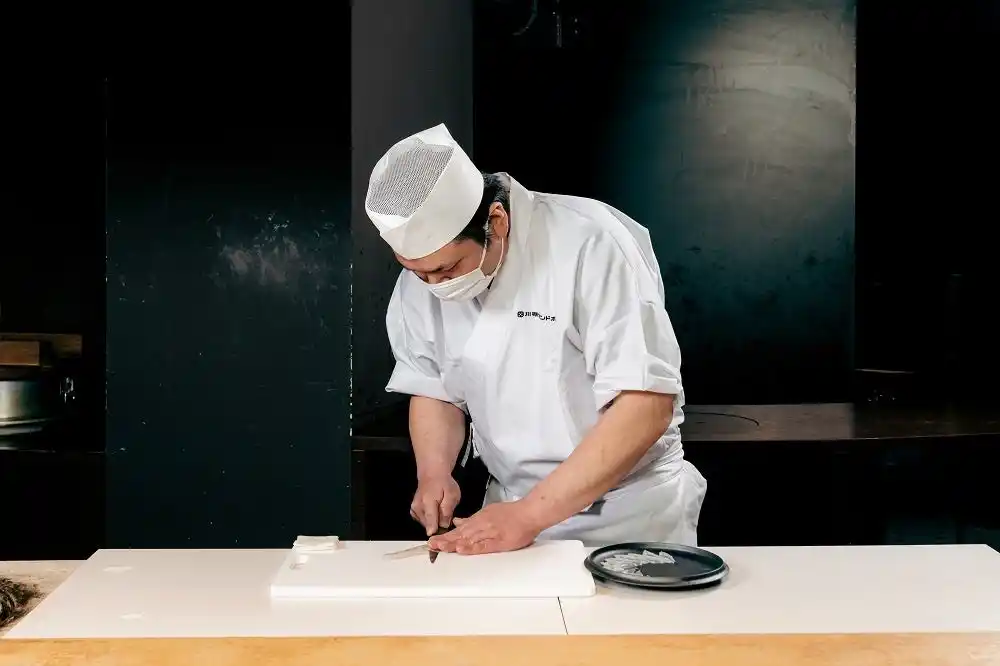 畑水産で丁寧な活かし込みを行い、身欠かれ、選定された質の高いとらふぐは、三日間の熟成期間を経てふくさしの身が完成します。寝かせることで旨味を増していくふぐの身。成熟したふくの旨味としっかりとした食感を大切に、調理人がやや厚めに引いていきます。 |