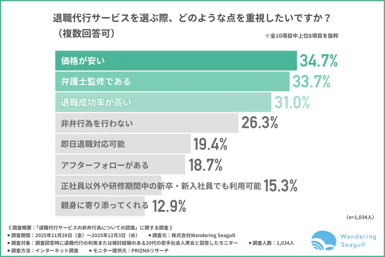 そのような背景から、退職代行サービスを選ぶ際は「価格が安い」「弁護士監修」「退職成功率が高い」といった点を重視したいと回答した方が多いことから、コストパフォーマンスと信頼性が選定基準であることが明らかになりました。 |
