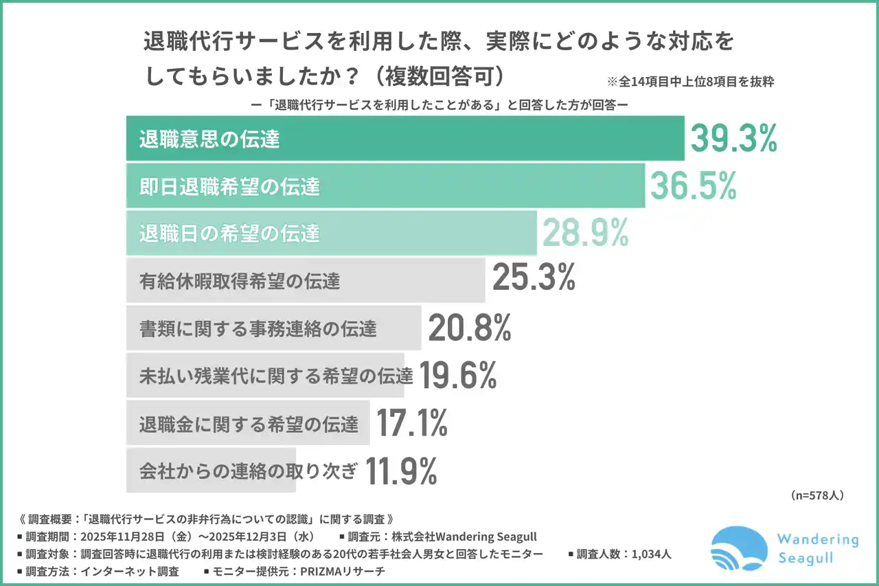 「退職代行サービスを利用した際、実際にどのような対応をしてもらったか」と尋ねたところ、『退職意思の伝達(39.3%)』『即日退職希望の伝達(36.5%)』『退職日の希望の伝達(28.9%)』など、「利用者の希望の伝達」が上位に挙がりました。 |
