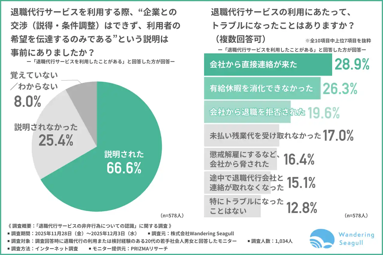 株式会社Wandering Seagull(所在地:新潟県新潟市、代表取締役:田村 広流)は、退職代行の利用または検討経験のある20代の若手社会人男女を対象に、「退職代行サービスの非弁行為についての認識」に関する調査を行いました。 |