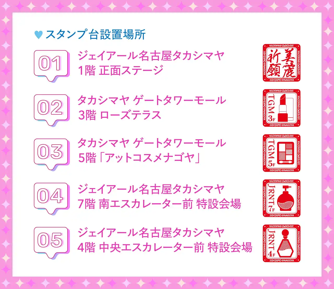ジェイアール名古屋タカシマヤ 1階 正面ステージを起点に、ジェイアール名古屋タカシマヤ、タカシマヤ ゲートタワーモールの各階に設置されたスタンプを御朱印帳に押印 |