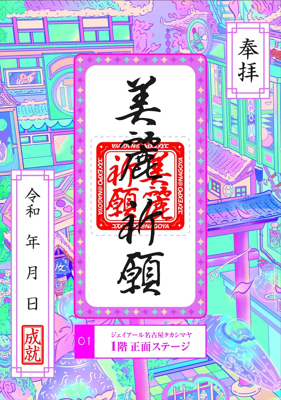 ネオン輝くピンクの鳥居とコンパクトケースを模した椅子に座って写真が撮れる、キュートなフォトスポットが登場。ステージでは、美容の神様が宿ると言われる京都の「河合神社」オリジナル絵馬(※)に理想の顔を描いて美麗祈願をしていただけます。 |