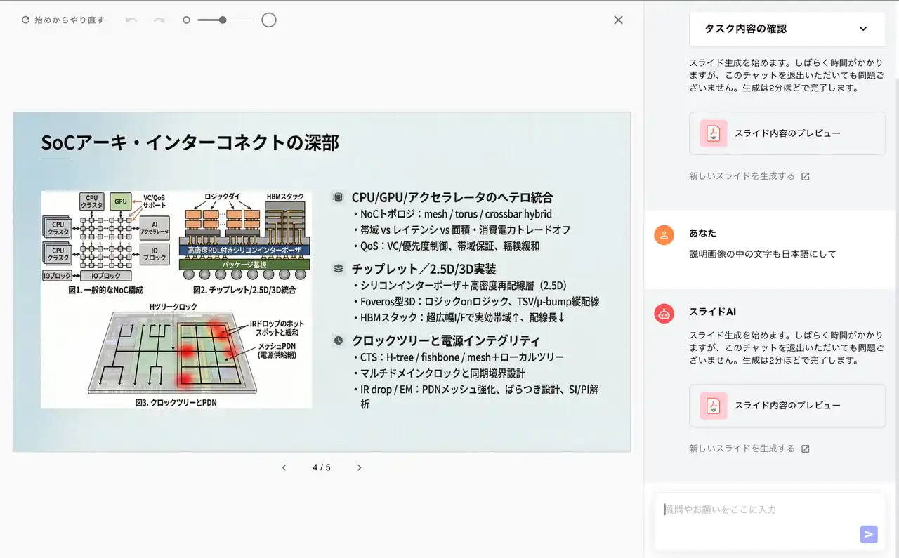 「自動編集機能」により、従来は人間がPowerPoint等で手作業で行っていた微調整作業を、AIによる部分再生成で置き換えることができます。これにより、最終仕上げにかかる工数を削減しつつ、スライド全体のトーンやデザインの一貫性を保ったまま、実用レベルの資料作成を支援します。 |