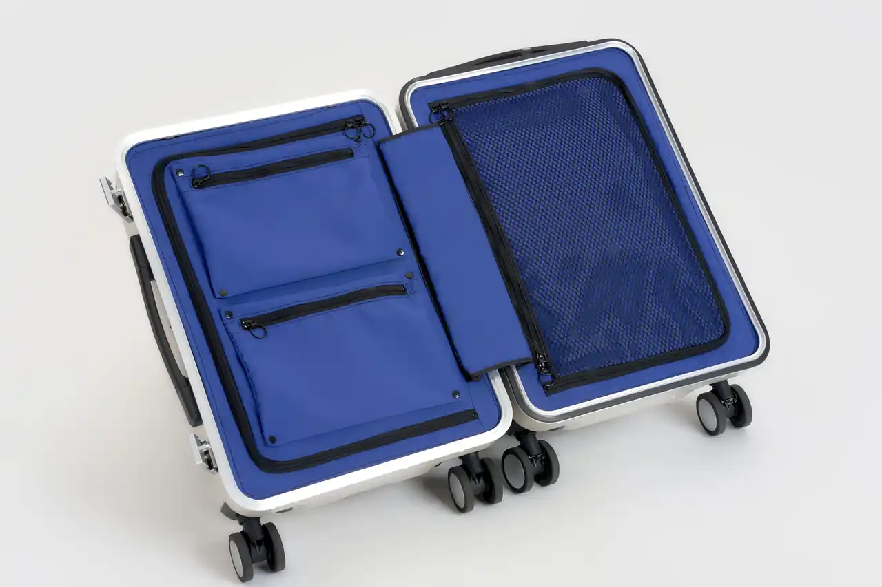 コーナープロテクターとロゴはアルミで高級感を演出。ビジネスでも旅行でも使いやすいシンプルで上質なデザイン。