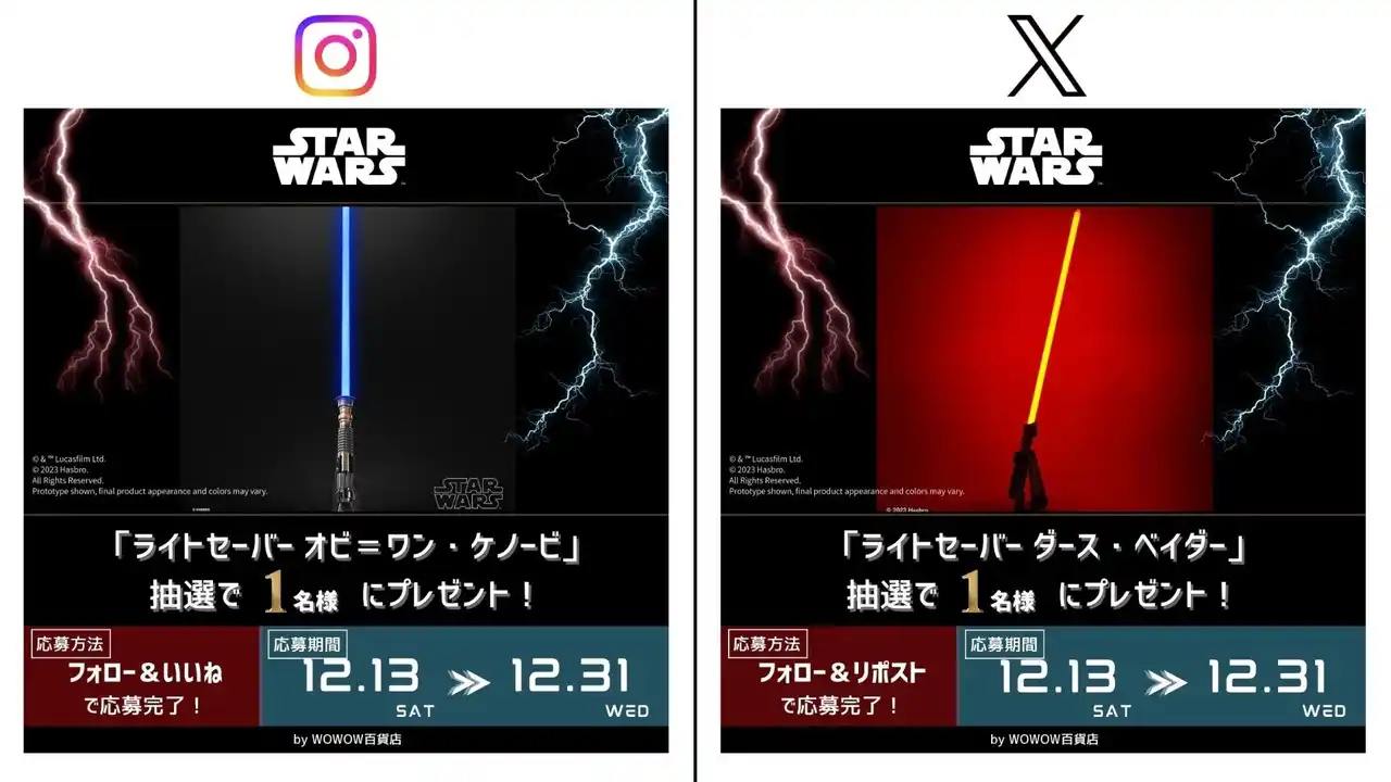 WOWOW百貨店公式InstagramおよびXでは、スター・ウォーズファンに向けたプレゼントキャンペーンを実施しています。本キャンペーンでは、劇中に登場するライトセーバーを忠実に再現した本格仕様モデルを、Instagram・Xそれぞれ抽選で1名様にプレゼントします。 |