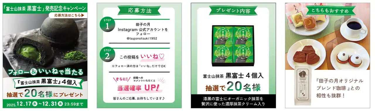 株式会社 田子の月(本社:静岡県富士市今泉380-1、代表取締役社長:牧田 桂輔)は、2025年12月13日に新商品「富士山抹茶 黒富士」を発売したことを記念して、Instagramでのフォロー&いいね!キャンペーンを本日より開始いたしました。 |