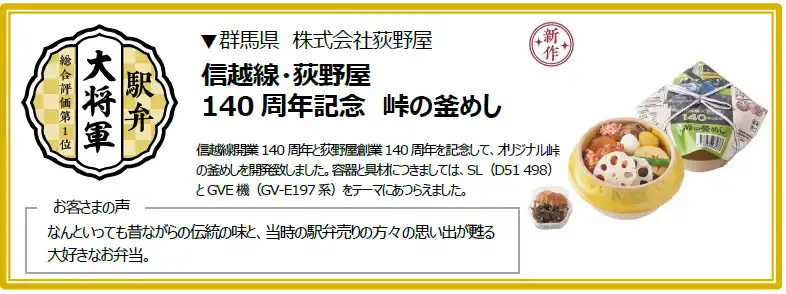 ○お客さまからの投票で総合評価が最も高かった「駅弁大将軍」には、群馬県の「信越線・荻野屋 140周年記念 峠の釜めし」(株式会社荻野屋)が選出され、その他「駅弁副将軍」など計15品の駅弁の受賞が決定しました。 |