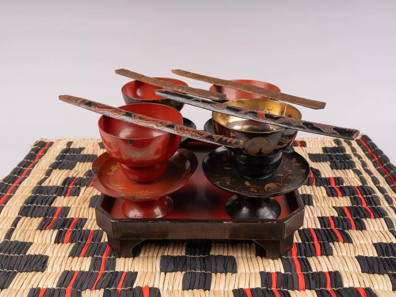 1.イクパスイ(酒を捧げる棒)、2.トゥキ(杯)、3.タカイサラ(天目台)、4.イタ/オッチケ(膳)、5.ポンチタラペ(模様入りござ) いずれも当館蔵 ※ポンチタラペのラは下付き小文字 |