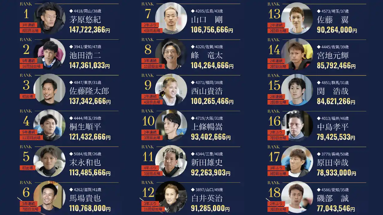 | ボートレーサー約1,600名のうち、年間獲得賞金上位の18名のみが出場できる大舞台をお届け! | |||