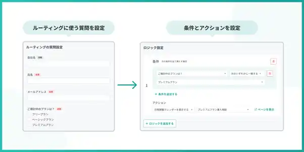 ルーティングフォームで「現在ご検討中の製品はどちらですか?」といった質問を設定し、回答に応じて製品ごとの日程調整カレンダーへ振り分けます。 |