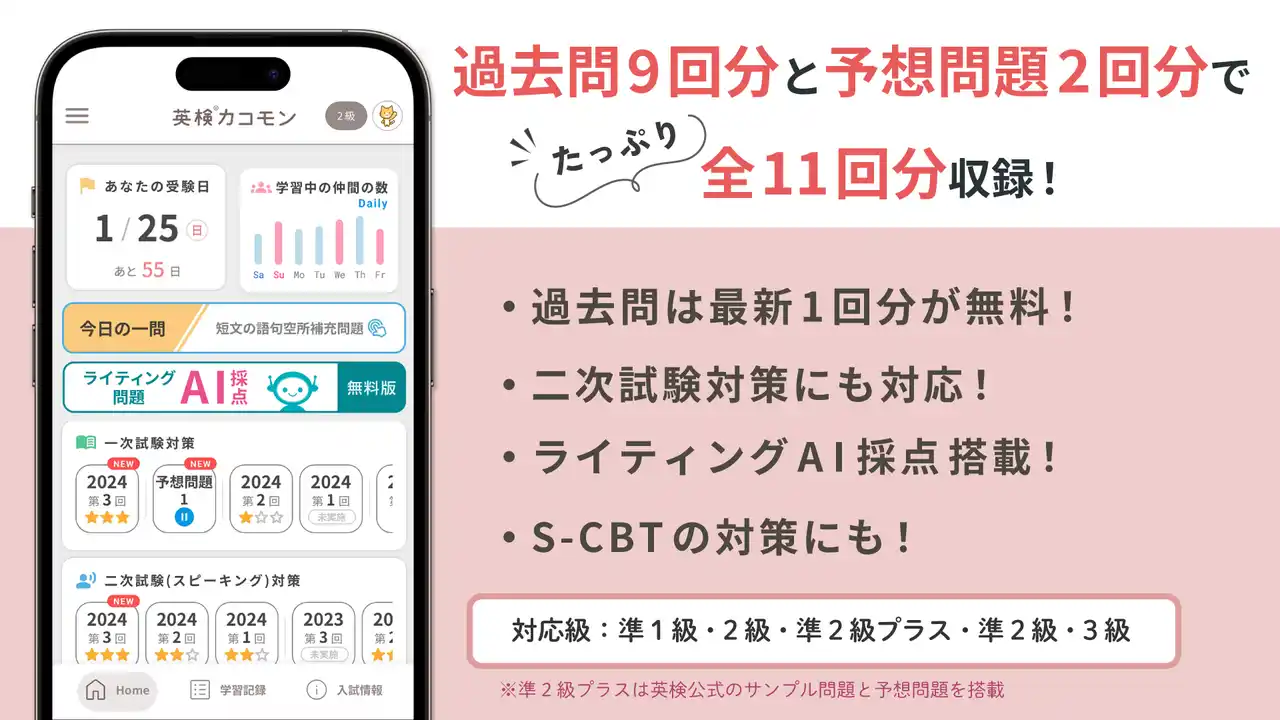 | 教育出版社の株式会社旺文社(東京都新宿区、代表取締役社長 粂川 秀樹)は、実用英語技能検定(以下、英検)の過去問学習ができるwebサービス「受験生のための英検(R)カコモン」(準1級~3級対応)に、2025年12月17日より新規予想問題を搭載するアップデートを行いました。より多くの問題で英検対策を可能にし、英検合格に向けて学習するみなさまを応援いたします。無料公開中のライティングAI採点では、引き続き2024年度第3回過去問のライティング解答の採点・添削が可能です。 | |||||||||||||