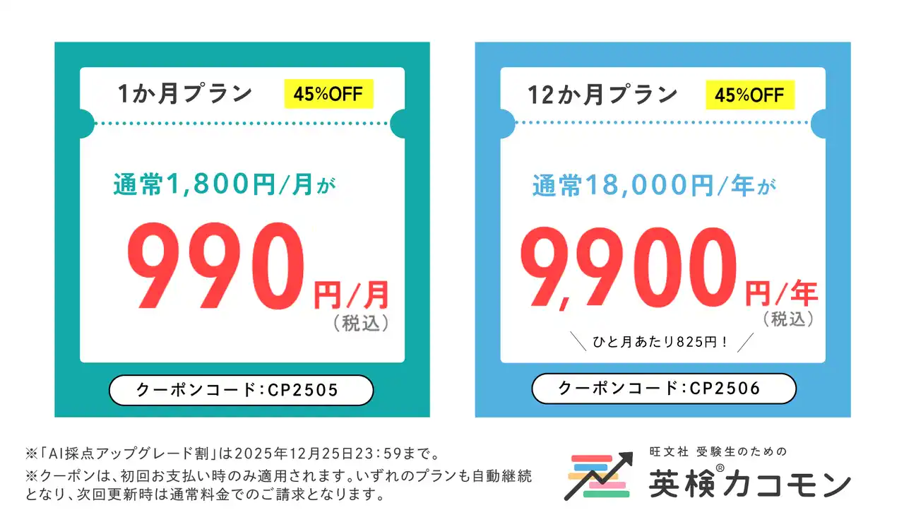| 「受験生のための英検(R)カコモン」にライティングAI採点公式版が搭載されたことを記念した、おトクなキャンペーンを2025年12月25日まで開催中です。 | |||||||||||||
