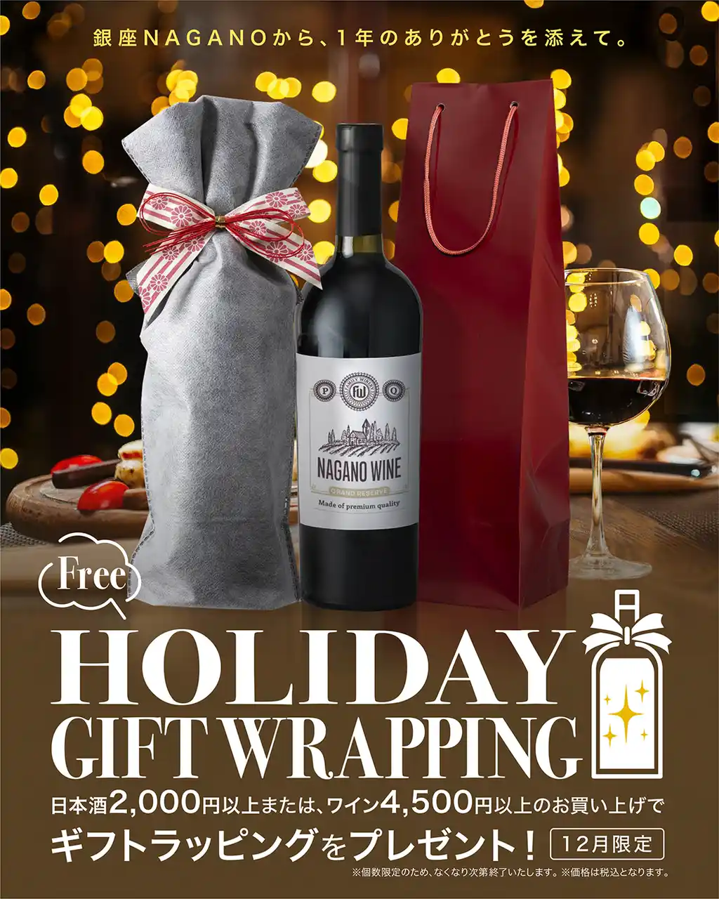 一定額以上の日本酒またはワインをご購入いただいたお客様に、銀座NAGANOから1年の感謝を込めて、ギフトラッピングを無料でプレゼント。幅広いシーンでのギフトに対応できるよう、長野県らしい水引飾りをあしらったリボンや、ワインレッドの袋でデコレーションいたします。今年の大切な人へのホリデーギフトには、長野県らしいお酒を選んでみてはいかがでしょうか。 |