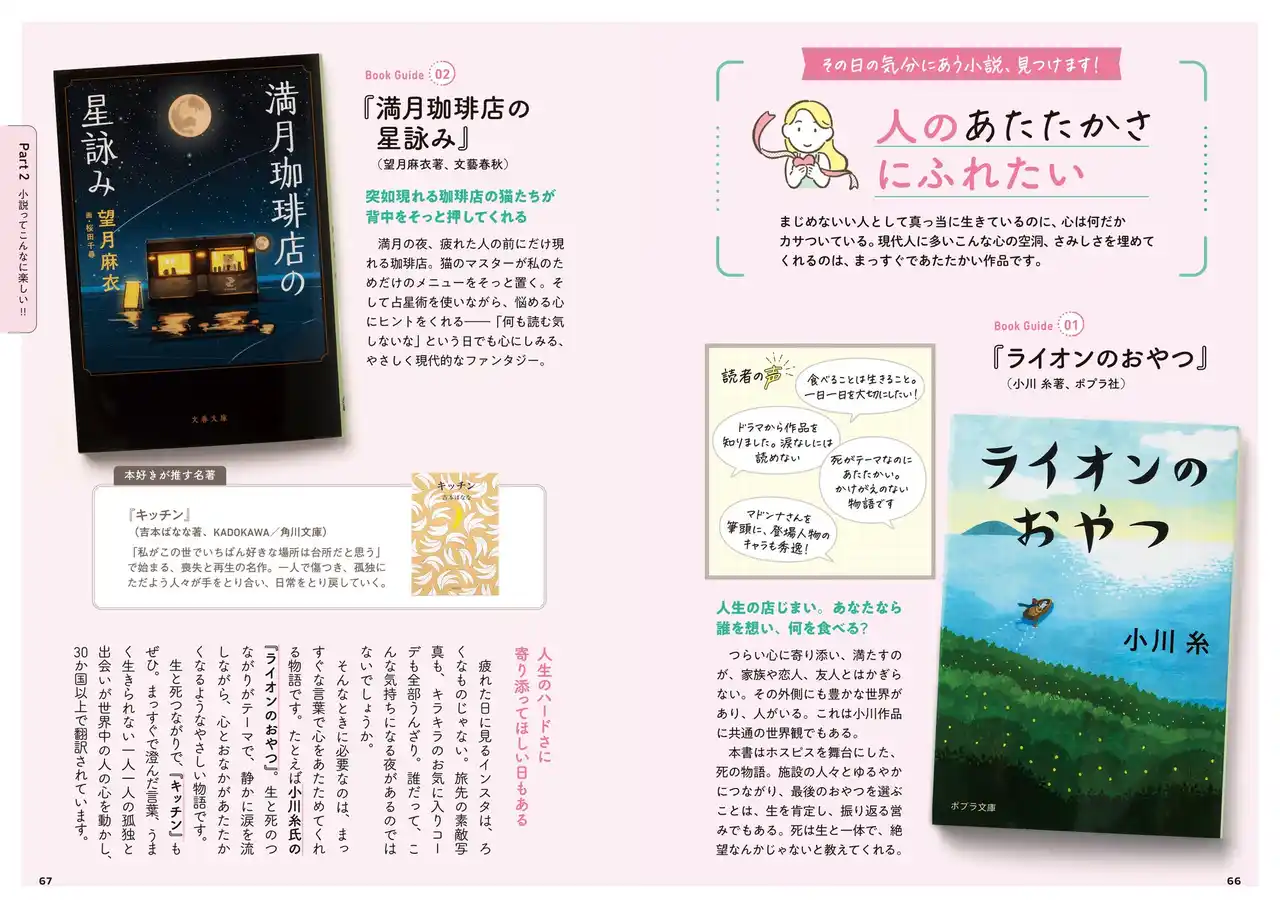 本書では、「小説」「エッセイ」「実用書」を中心に、初心者や苦手意識のある方でも読みやすい書籍を紹介。また、それぞれのジャンルごとに楽しみ方も解説しています。ドラマや映画など映像化された作品、話題になったベストセラーから、笑いたいとき・泣きたいときに読みたいお話、いやされるエッセイ、かわいいものがたくさんつまった本など、読みたい1冊が必ず見つかります。少しでも興味がわいてきたら、そこが本の世界への入り口! はじめの一歩を踏み出してみませんか。 |